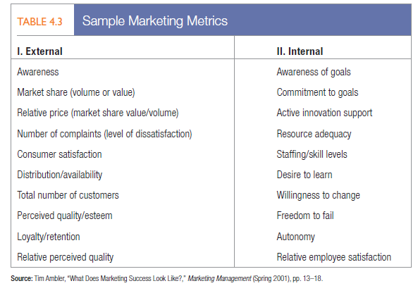 Companies can also monitor an extensive set of internal metrics, such as innovation. For example, 3M tracks the proportion of sales resulting from its recent innovations. Ambler also recommends developing employee measures and metrics, arguing that “end users are the ultimate customers, but your own staff are your first; you need to measure the health of the internal market.” Table 4.3 summarizes a list of popular internal and external marketing metrics from Ambler’s survey in the United Kingdom.52