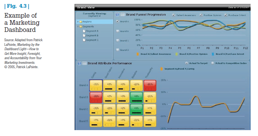 Firms are also employing organizational processes and systems to make sure they maximize the value of all these different metrics. Management can assemble a summary set of relevant internal and external measures in a marketing dashboard for synthesis and interpretation. Marketing dashboards are like the instrument panel in a car or plane, visually displaying real-time indicators to ensure proper functioning. Formally, marketing dashboards are “a concise set of interconnected performance drivers to be viewed in common throughout the organization.”55