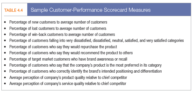 - A customer-performance scorecard records how well the company is doing year after year on such customer-based measures as those shown in Table 4.4. Management should set target goals for each measure and take action when results get out of bounds.