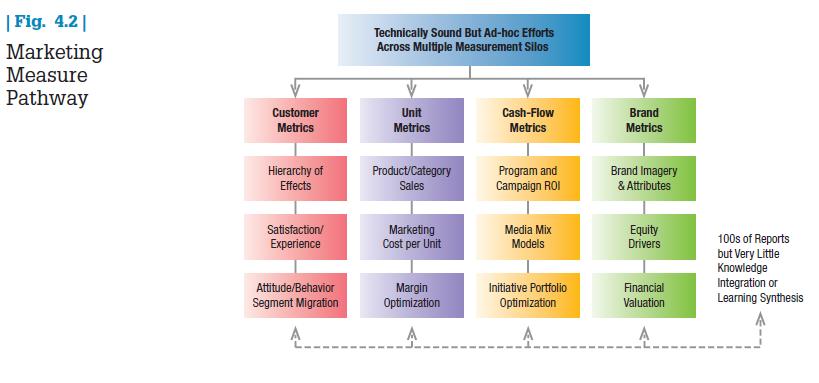 Marketing consultant Pat LaPointe sees marketing dashboards as providing all the up-to-the-minute information necessary to run the business operations for a company—such as sales versus forecast, distribution channel effectiveness, brand equity evolution, and human capital development. According to LaPointe, an effective dashboard will focus thinking, improve internal communications, and reveal where marketing investments are paying off and where they aren’t. LaPointe observes four common measurement “pathways” marketers pursue today (see Figure 4.2).