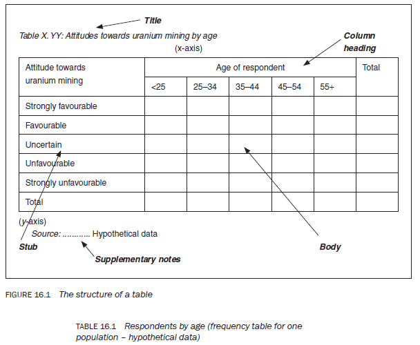Other than text, tables are the most common method of presenting analysed data. According to The Chicago Manual of Style (1993: 21), ‘Tables offer a useful means of presenting large amounts of detailed information in a small space.’ According to the Commonwealth of Australia Style Manual (2002: 46), ‘tables can be a boon for readers. They can dramatically clarify text, provide visual relief, and serve as quick point of reference.’ It is, therefore, essential for beginners to know about their structure and types. Figure 16.1 shows the structure of a table. A table has five parts: