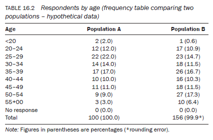 Tables 16.1 and 16.2 are univariate or frequency tables. In any univariate table, percentages calculate the magnitude of each subcategory of the variable out of a constant number (100). Such a table shows what would have been the expected number of respondents in each subcategory had there been 100 respondents. Percentages in a univariate table play a more important role when two or more samples or populations are being compared (Table 16.2). As the total number of respondents in each sample or population group normally varies, percentages enable you to standardise them against a fixed number (100). This standardisation against 100 enables you to compare the magnitude of the two populations within the different subcategories of a variable.