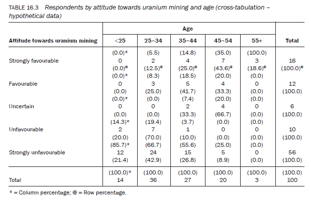 - Total percentage – This standardises the magnitude of each cell; that is, it gives the percentage of respondents who are classified in the subcategories of one variable in relation to the subcategories of the other variable. For example, what percentage do those who are under the age of 25 years, and hold a strongly unfavourable attitude towards uranium mining, constitute of the total population?