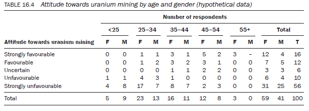 The introduction of the third variable, gender, helps you to find out how the observed association between the two subcategories of the two variables, age and attitude, is distributed in relation to gender. In other words, it helps you to find out how many males and females constitute a particular cell showing the association between the other two variables. For example, Table 16.4 shows that of those who have a strongly unfavourable attitude towards uranium mining, 24 (42.9 per cent) are 25—34 years of age. This group comprises 17 (70.8 per cent) females and 7 (29.2 per cent) males. Hence, the table shows that a greater proportion of female than male respondents between the ages of 25 and 34 hold a strongly unfavourable attitude towards uranium mining. Similarly, you can take any two subcategories of age and attitude and relate these to either subcategory (male/female) of the third variable, gender.