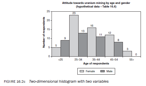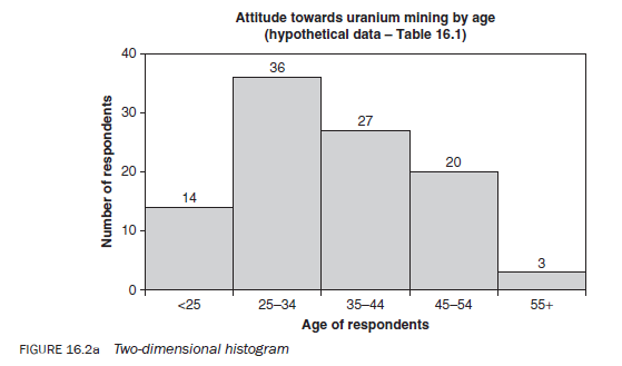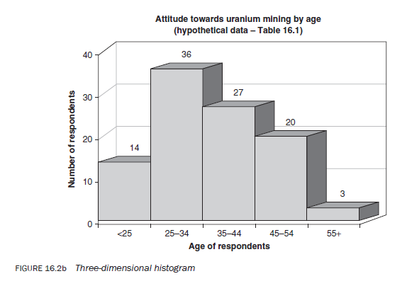 A histogram consists of a series of rectangles drawn next to each other without any space between them, each representing the frequency of a category or subcategory (Figures, 16.2a,b,c). Their height is in proportion to the frequency they represent. The height of the rectangles may represent the absolute or proportional frequency or the percentage of the total. As mentioned, a histogram can be drawn for both categorical and continuous variables. When interpreting a histogram you need to take into account whether it is representing categorical or continuous variables. Figures 16.2a, b and c provide three examples of histograms using data from Tables 16.1 and 16.4. The second histogram is effectively the same as the first but is presented in a three-dimensional style.
