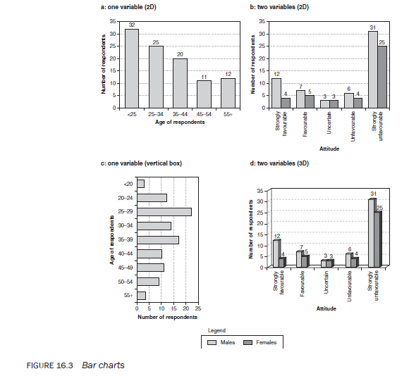 The bar chart or diagram is used for displaying categorical data (Figure 16.3). A bar chart is identical to a histogram, except that in a bar chart the rectangles representing the various frequencies are spaced, thus indicating that the data is categorical. The bar chart is used for variables measured on nominal or ordinal scales. The discrete categories are usually displayed along the x-axis and the number or percentage of respondents on the y-axis. However, as illustrated, it is possible to display the discrete categories along the y-axis. The bar chart is an effective way of visually displaying the magnitude of each subcategory of a variable.