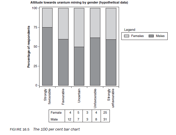 The 100 per cent bar chart (Figure 16.5) is very similar to the stacked bar chart. In this case, the subcategories of a variable are converted into percentages of the total population. Each bar, which totals 100, is sliced into portions relative to the percentage of each subcategory of the variable.