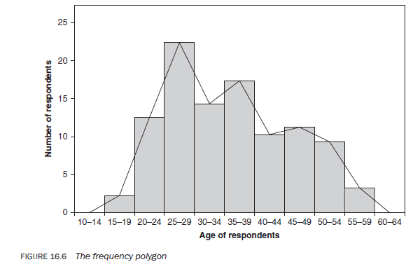 The frequency polygon is very similar to a histogram. A frequency polygon is drawn by joining the midpoint of each rectangle at a height commensurate with the frequency of that interval (Figure 16.6). One problem in constructing a frequency polygon is what to do with the two categories at either extreme. To bring the polygon line back to the x-axis, imagine that the two extreme categories have an interval similar to the rest and assume the frequency in these categories to be zero. From the midpoint of these intervals, you extend the polygon line to meet the x-axis at both ends. A frequency polygon can be drawn using either absolute or proportionate frequencies.