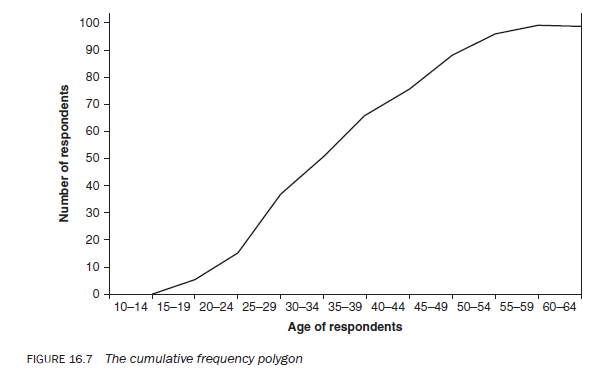 The cumulative frequency polygon or cumulative frequency curve (Figure 16.7) is drawn on the basis of cumulative frequencies. The main difference between a frequency polygon and a cumulative frequency polygon is that the former is drawn by joining the midpoints of the intervals, whereas the latter is drawn by joining the end points of the intervals because cumulative frequencies interpret data in relation to the upper limit of an interval. As a cumulative frequency distribution tells you the number of observations less than a given value and is usually based upon grouped data, to interpret a frequency distribution the upper limit needs to be taken.