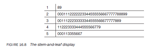 The stem-and-leaf display is an effective, quick and simple way of displaying a frequency distribution (Figure 16.8). The stem-and-leaf diagram for a frequency distribution running into two digits is plotted by displaying digits 0 to 9 on the left of the y-axis, representing the tens of a frequency. The figures representing the units of a frequency (i.e. the right-hand figure of a two-digit frequency) are displayed on the right of the y-axis. Note that the stem-and-leaf display does not use grouped data but absolute frequencies. If the display is rotated 90 degrees in an anti-clockwise direction, it effectively becomes a histogram. With this technique some of the descriptive statistics relating to the frequency distribution, such as the mean, the mode and the median, can easily be ascertained; however, the procedure for their calculation is beyond the scope of this book. Stem-and-leaf displays are also possible for frequencies running into three and four digits (hundreds and thousands).