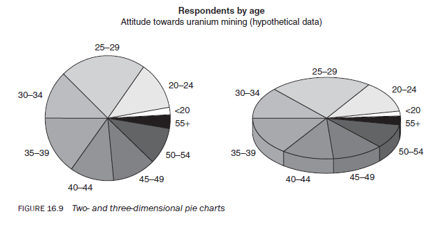 The pie chart is another way of representing data graphically (Figure 16.9), this time as a circle. There are 360 degrees in a circle, and so the full circle can be used to represent 100 per cent, or the total population. The circle or pie is divided into sections in accordance with the magnitude of each subcategory, and so each slice is in proportion to the size of each subcategory of a frequency distribution. The proportions may be shown either as absolute numbers or as percentages. Manually, pie charts are more difficult to draw than other types of graph because of the difficulty in measuring the degrees of the pie/circle. They can be drawn for both qualitative data and variables measured on a continuous scale but grouped into categories.