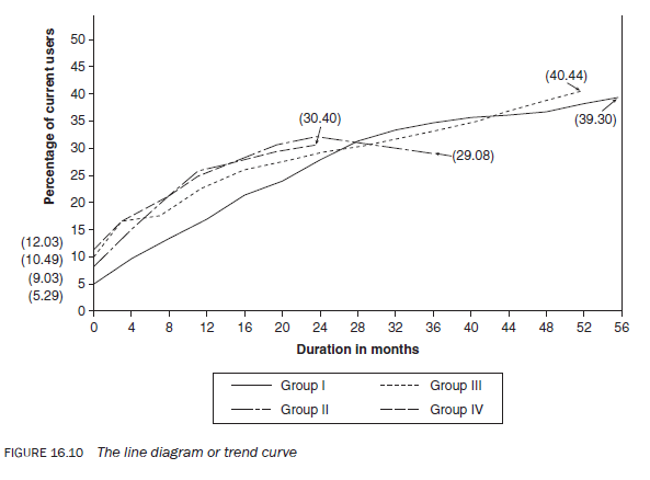 A set of data measured on a continuous interval or a ratio scale can be displayed using a line diagram or trend curve. A trend line can be drawn for data pertaining to both a specific time (e.g. 1995, 1996, 1997) or a period (e.g. 1985—1989, 1990—1994, 1995—). If it relates to a period, the midpoint of each interval at a height commensurate with each frequency — as in the case of a frequency polygon — is marked as a dot. These dots are then connected with straight lines to examine trends in a phenomenon. If the data pertains to exact time, a point is plotted at a height commensurate with the frequency. These points are then connected with straight lines. A line diagram is a useful way of visually conveying the changes when long-term trends in a phenomenon or situation need to be studied, or the changes in the subcategory of a variable are measured on an interval or a ratio scale (Figure 16.10). Trends plotted as a line diagram are more clearly visible than in a table. For example, a line diagram would be useful for illustrating trends in birth or death rates and changes in population size.