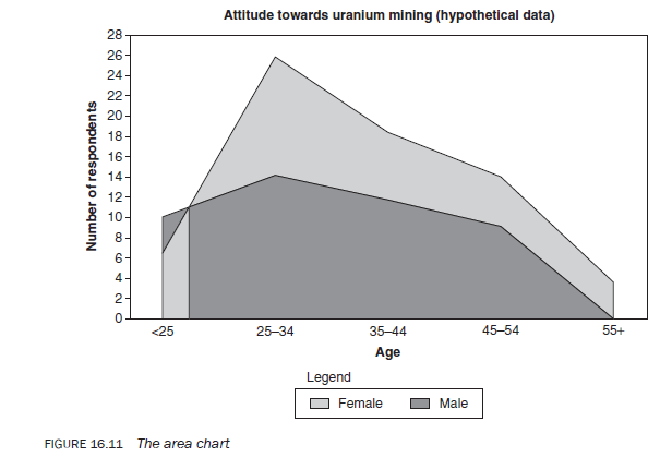 For variables measured on an interval or a ratio scale, information about the subcategories of a variable can also be presented in the form of an area chart. This is plotted in the same way as a line diagram but with the area under each line shaded to highlight the total magnitude of the subcategory in relation to other subcategories. For example, Figure 16.11 shows the number of male and female respondents by age.