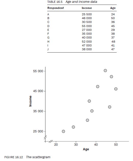 For a scattergram, both the variables must be measured either on interval or ratio scales and the data on both the variables needs to be available in absolute values for each observation — you cannot develop a scattergram for categorical variables. Data for both variables is taken in pairs and displayed as dots in relation to their values on both axes. Let us take the data on age and income for 10 respondents of a hypothetical study in Table 16.5. The relationship between age and income based upon hypothetical data is shown in Figure 16.12.