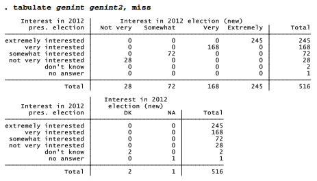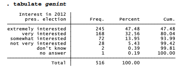 Different kinds of missing values often arise with surveys, where the question “In what year were you married?” might have no answer because the respondent has never been married, can’t recall, or thinks it’s none of your business. Dataset Granite2011_6.dta, contains data from a political opinion survey, New Hampshire’s Granite State Poll. A question asking respondents about their level of interest regarding the 2012 general election (genint) serves to illustrate Stata’s extended missing-value codes.