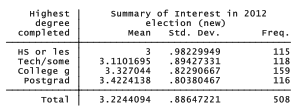 With these changes we have a more analyzable version. For example, it is easy to see that the average level of interest in the election rises with education.