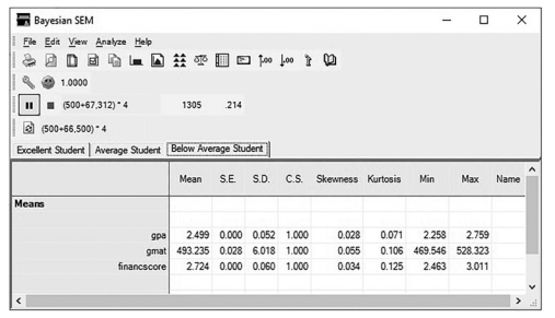 The Bayesian window will provide a lot descriptives about your classifications.There is a tab at the top of the window that will allow you to see the information for each group.You can see the “Average” student has a mean GMAT score of 552, a GPA of 3.21, and an average finance score of 2.99 on a 1-to-4 scale. As well, the analysis will give you the maximum and minimum score to classify as an “Average” student. In the Below Average group, the initial results show that students that have a GPA less than a 2.50 and a score under 500 on the GMAT have a high probability of being classified as a below average student.