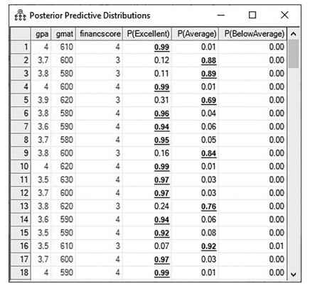 .When you click on this button, you will initially see the rows blinking with changing numbers, but after a few seconds the numbers will stabilize. In this window, you will see the probability for each student to be classified as excellent, average, or below average. In our data set, the first 50 rows were our new applicants. In the posterior prediction, those rows now have a prediction for each student.