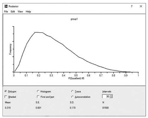 For instance, the student in row 5 had an 69% probability of being an average student and a 31% probability of being an excellent student. This student also had a relative zero probability of being a below average student. While these probabilities are nice, I find that looking at how the posterior prediction is graphed will give you more context to that probability prediction. If we double click into student 5’s “excellent” prediction of 31%, AMOS will show us more information about this prediction in a graphical form. See Figure 10.21. The graphic shows that the mean prediction is 31%, but if you examine the left-hand side of the graph, there is a large frequency of predictions that note this student has an even smaller probability of being an excellent student. The probability predictions are skewed to the left, or specifically, that there is a smaller likelihood of this student being classified as excellent at the end of the program. The graph gives us more context to the prediction and also lets us know what probability had the highest frequency. You can view a graph of any probability in posterior prediction by simply double clicking on the value. Ultimately, the probability derived from the Bayesian analysis is only as good as the training data. If your training data is biased or flawed, the posterior prediction will most certainly be flawed, too.
