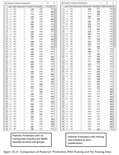 After you read in the data for each group, the analysis is exactly the same steps as the example when we used the training data. When you get to the posterior prediction, you will see three clusters and the probability of each candidate falling into a cluster. In Fig- ure 10.23, I have included a posterior prediction that had training data and one that had no training data and how AMOS clustered the data into three groups.You can see that AMOS correctly predicted some students, but others are classified differently when there is no training data. For example, the student in row 13 is considered a 24% probability of being an Excellent student with the training data included and the same student is classified as a 4% probability of being in the Excellent group when no training data is included and AMOS assigns the groups. Ultimately, having training data will lead to better predictions in the end.