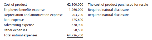 - Expenses in an IFRS income statement are classified by either their nature or function. The nature of an expense is how the expense would naturally be recorded in a journal entry reflecting the economic benefit received for that expense. Examples include salaries, depreciation, advertising, and utilities. The function of an expense identifies the purpose of the expense, such as a selling expense or an administrative expense. IFRS does not permit the natural and functional classifications to be mixed together on the same statement. That is, all expenses must be classified by either nature or function. However, if a functional classification of expenses is used, a note to the income statement must show the natural classification of expenses. To illustrate, because Mornin’ Joe International uses the functional classification of expenses in its income statement, it must also show the following natural classification of expenses in a note: