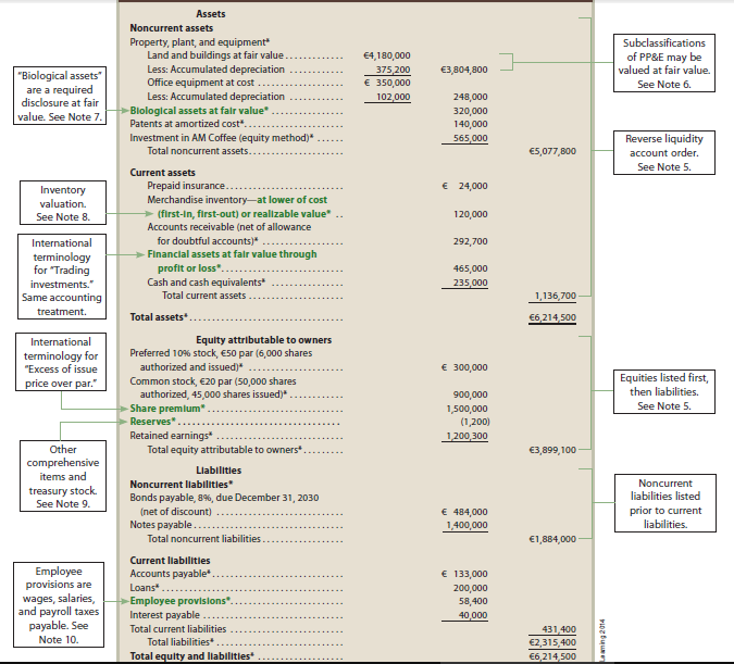 The following Mornin’ Joe International financial statements are simplified and illustrate only portions of IFRS that are appropriate for introductory accounting. The financial statements are presented in euros (€) for demonstration purposes only. The euro is the standard currency of the European Union. The euro is translated at a 1:1 ratio from the dollar to simplify comparisons. Throughout the illustration, callouts and end notes to each statement are used to highlight the differences between financial statements prepared under IFRS and under U.S. GAAP.