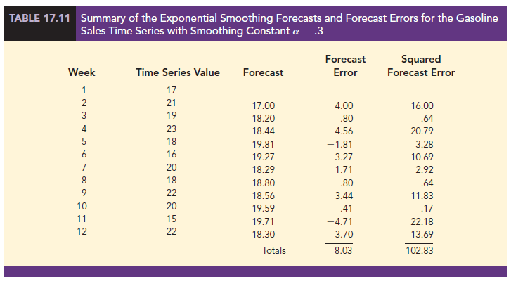 The exponential smoothing results with a = .3 are shown in Table 17.11. The value of the sum of squared forecast errors is 102.83; hence MSE = 102.83/11 = 9.35. With MSE = 9.35, we see that, for the current data set, a smoothing constant of a = .3 results in less forecast accuracy than a smoothing constant of a = .2. Thus, we would be inclined to prefer the original smoothing constant of a = .2. Using a trial-and-error calculation with other values of a, we can find a “good” value for the smoothing constant. This value can be used in the exponential smoothing model to provide forecasts for the future. At a later date, after new time series observations are obtained, we analyze the newly collected time series data to determine whether the smoothing constant should be revised to provide better forecasting results.