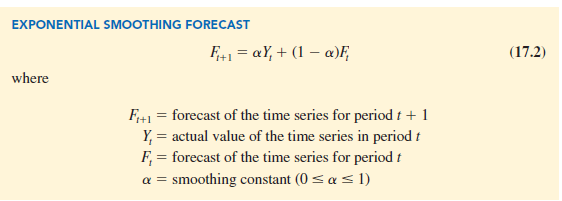 Despite the fact that exponential smoothing provides a forecast that is a weighted average of all past observations, all past data do not need to be saved to compute the forecast for the next period. In fact, equation (17.2) shows that once the value for the smoothing constant a is selected, only two pieces of information are needed to compute the forecast: Yt, the actual value of the time series in period t, and Ft, the forecast for period t.