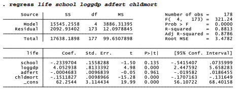 We can incorporate other possible predictors of life simply by listing these variables in the regress command. For example, the following command would regress life expectancy on per capital GDP, adolescent fertility rate and child mortality.