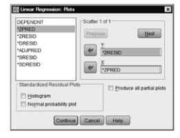 - Move ZPRED to the X: box. This enables us to check the assumption that the predictors and residual are uncorrelated.