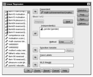 - Select math achievement and click it over to the Dependent box (dependent variable).