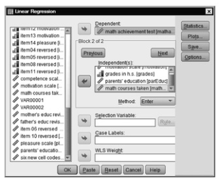 - Then move motivation scale, grades in h.s., parents’ education, and math courses taken to the Independent(s) box (independent variables).