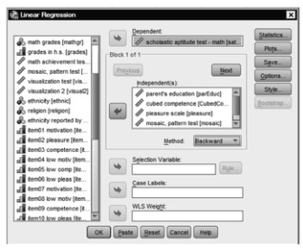 /METHOD=BACKWARD parEduc CubedComp pleasure mosaic mathach.