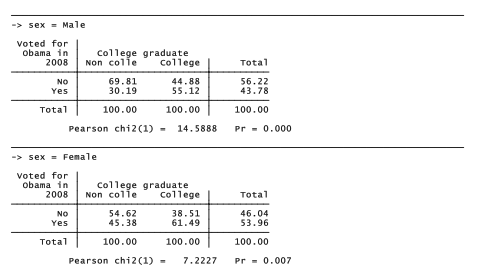 One way to make a three-way cross-tabulation of the obama/college relationship by gender is to use sort and the by: prefix. This produces two-way tables with the same layout as above, but separately for males and females.