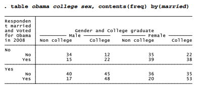 This approach can be extended to tabulations of greater complexity. To get a four-way crosstabulation of obama by college, with separate sub-tables for married and unmarried men and women, we could type the commands (results not shown):