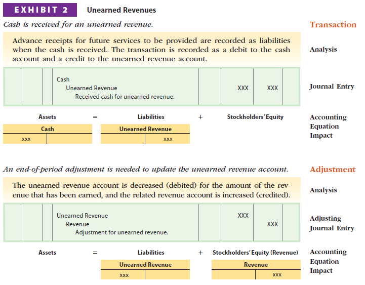 Prepaid expenses and unearned revenues are sometimes referred to as deferrals. This is because the recording of the related expense or revenue is deferred to a future period. Accrued revenues and accrued expenses are sometimes referred to as accruals. This is because the related revenue or expense should be recorded or accrued in the current period.