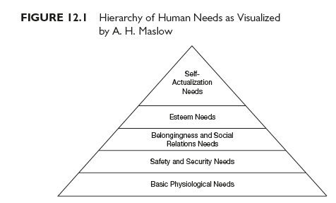 A.H. Maslow, a psychologist, developed a theory of motivation based on the notion that an individual seeks to fulfill personal needs according to some hierarchy of importance. He suggests the general priority of need fulfillment shown in Figure 12.1.1 Maslow suggests that after an individual gratifies basic physiological needs, he or she proceeds to strive to fulfill safety and security needs, then belongingness and social relations needs, and so on—the individual’s level of aspiration rising as needs on higher levels are satisfied. Not every individual and certainly not every salesperson, of course, establishes the order of priority of need fulfillment suggested by Maslow. Some sales personnel, for instance, appear to assign earlier priority to filling the esteem need (for self-respect) than they do to filling the need for social relations within a group.