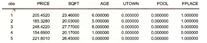 Opening a Group (hold Ctrl click each series, double-click in blue) with the variables we see that PRICE, SQFT and AGE contain the usual type of values, but the rest are 0’s and 1 ’s. These are dummy variables. They are used in a regression just like any other variables. Estimate the POE equation (7.13). Use Quick/Estimate Equation or enter the command