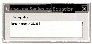 Creating dummy variables is not exactly like creating any other variable. To create a dummy variable that is 1 for large houses, and zero otherwise we must decide what a large house is. The summary statistics for SQFT shows that the median house size in the sample is 2536 square feet. Because SQFT is measured in 100’s of square feet, this is SQFT = 25.36. Suppose that houses larger than this size we take to be “large”. On the workfile window click the Genr button and enter