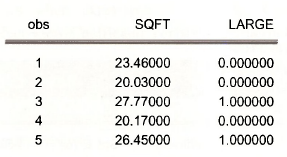 What this does is create a new variable, LARGE, that takes the value 1 if the statement (sqft > 25.36) is true for a particular observation, and zero otherwise. Looking the first few observations we can see that this has worked.