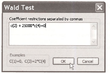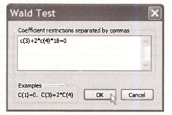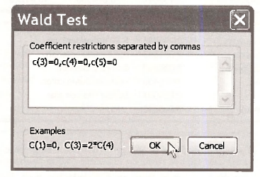 In the regression window, select View/Coefficient TestsAVald – Coefficient Restrictions. Using the equation representation we see that it is the coefficients C(3), C(4) and C(5) that we wish to test.
