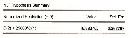 The Wald test results include the marginal effect, which we posed to EViews as a hypothesis, and its standard error.