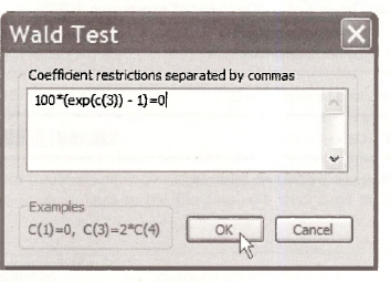 The exact calculation of the effect of gender on wages looks complicated, but it is simple in EViews. Select View/Coefficient Tests/Wald – Coefficient Restrictions. In EViews the exponential function is exp. To make the nonlinear calculation enter it as a hypothesis.