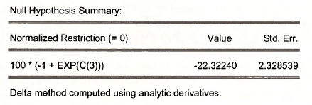 The calculated percentage difference in wages is -22.32% and EViews computes a standard error for this quantity by the “Delta method,” which you will study in your graduate econometrics courses.