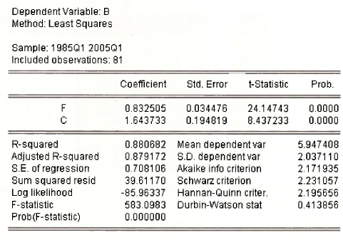 To test whether the nonstationary variables, B and F, are cointegrated or spuriously related, we need to examine the properties of the regression residuals. The first step is to estimate the least squares regression: