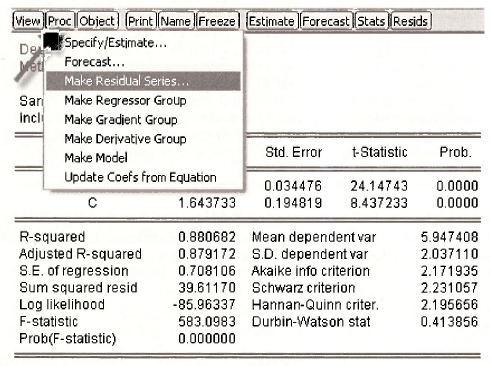 Next, to generate the residuals from the regression equation, click on Proc and select Make Residual Series from the drop-down menu.