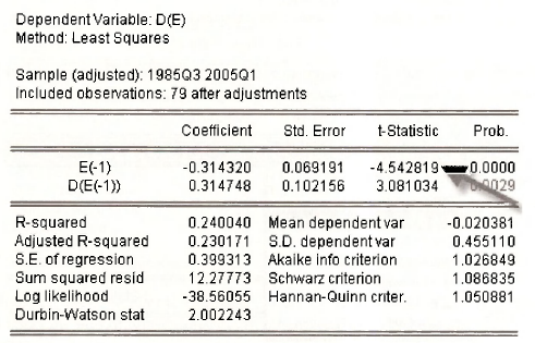 Next perform a Dickey-Fuller test by regressing the change of E, (namely, d(e)) on lagged E (namely e(-1)) and the lagged term d(e(-1)).