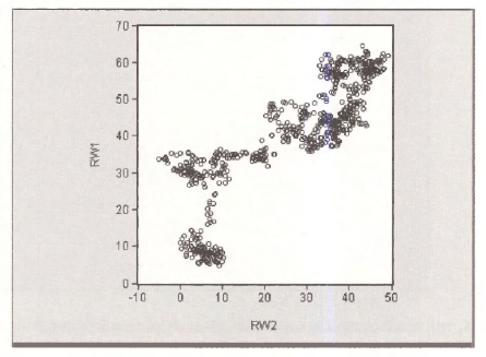The EViews workfile spurious.wfl contains the 2 random variables (RW1 and RW2) shown in Figure 12.3(a). To plot the scatter graph, select the 2 variables, open Group, View / Graph/ and select Scatter as shown below.