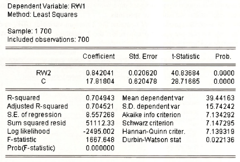 Although the series (RW1 and RW2) were generated independently and, in truth, have no relation to one another, the scatter plot suggests a positive relationship between them. The spurious regression of series one (RW1) on series two (RW2) is shown in the EViews ouput below.