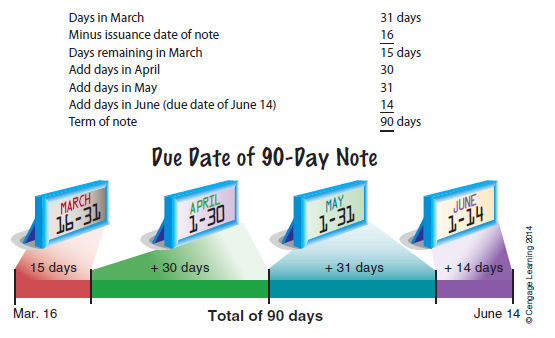 Exhibit 4 illustrates a promissory note. The maker of the note is Selig Company, and the payee is Pearland Company. The face value of the note is $2,000, the interest rate is 10%, and the issuance date is March 16, 2013. The term of the note is 90 days, which results in a due date of June 14, 2013, as shown below.